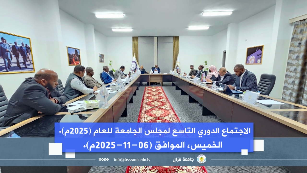 ● عقد مجلس الجامعة اليوم الخميس الموافق (6-11-2025م) على تمام الساعة (10:00)صباحا في قاعة الاجتماعات الرئيسية بمبنى الإدارة العامة للجامعة بمدينة مرزق، الاجتماع الدوري التاسع للمجلس للعام الجاري (2025م) برئاسة أ.د المهدي ميلاد الجدي رئيس الجامعة ،وبحضور أ.د.إبراهيم المهدي أحمد وكيل الشؤون العلمية للجامعة،والمسجل العام،والكاتب العام، وعمداء الكليات، ومديري المراكز والمكاتب التابعة لها؛ حيث ناقش أعضاء المجلس في اجتماعهم جدول الأعمال التالي: