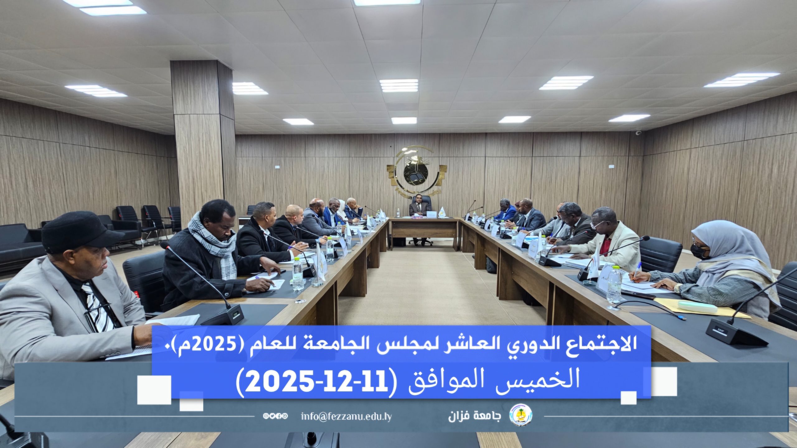 عقد مجلس الجامعة اليوم الخميس الموافق (11-12-2025م) على تمام الساعة (10:00)صباحا في قاعة الاجتماعات الرئيسية بكلية التمريض – تراغن – الاجتماع الدوري العاشر للمجلس للعام الجاري (2025م) برئاسة أ.د المهدي ميلاد الجدي رئيس الجامعة ،وبحضور أ.د.إبراهيم المهدي أحمد وكيل الشؤون العلمية للجامعة،والكاتب العام، والمسجل العام، وعمداء الكليات، ومديري المراكز والمكاتب التابعة لها.