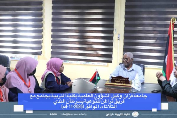 كلية التربية، جامعة فزان. وكيل الشؤون العلمية بكلية التربية يجتمع مع فريق تراغن للتوعية بسرطان الثدي. الثلاثاء، الموافق (4-11-2025م). ●