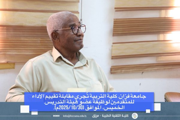 كلية التربية، جامعة فزان. كلية التربية تُجري مقابلة تقييم الأداء للمتقدمين لوظيفة عضو هيئة التدريس. الخميس، الموافق (2025/10/30م). ● في إطار جهودها الرامية إلى تطوير الأداء الأكاديمي وضمان استقطاب الكفاءات المؤهلة،… وبإشراف وكيل الشؤون العلمية،...
