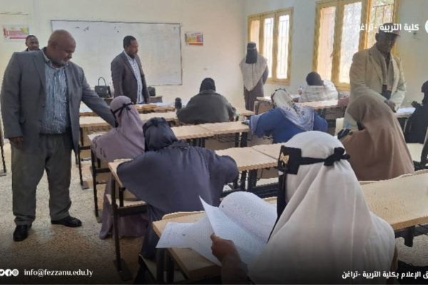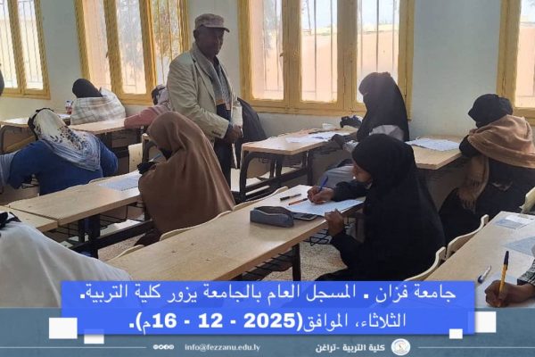 ● في إطار حرص إدارة جامعة فزان على المتابعة المستمرة لسير الامتحانات، قام أ.بشير علي بشير المسجل العام بجامعة فزان ، رفقة أ. فتحي سليمان مدير مكتب الدراسة والامتحانات بإدارة المسجل العام، صباح يوم الثلاثاء (16 -12-2025م) بزيارة تفقدية إلى كلية التربية – تراغن – للاطلاع على سير امتحانات طلبة الكلية.