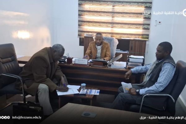 كلية التقنية الطبية، جامعة فزان. عميد الكلية يعقد اجتماعًا مع إدارة الدراسات العليا وقسم البحوث والاستشارات بالكلية. ● عقد د.مؤمن