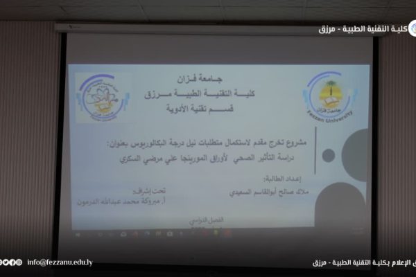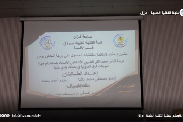 ● سعيًا من كلية التقنية الطبية – مرزق – لدعم البحث العلمي وتطويره، والعمل على تخريج كوادر مؤهلة قادرة على الإسهام في خدمة المجتمع والقطاع الصحي،…عقدت صباح اليوم الخميس الموافق (29-01-2026م) في مسرح الكلية جلسة علمية؛ لمناقشة بحوث التخرج لطلبة قسمي تقنية الأشعة، وتقنية الأدوية للفصل الدراسي، خريف