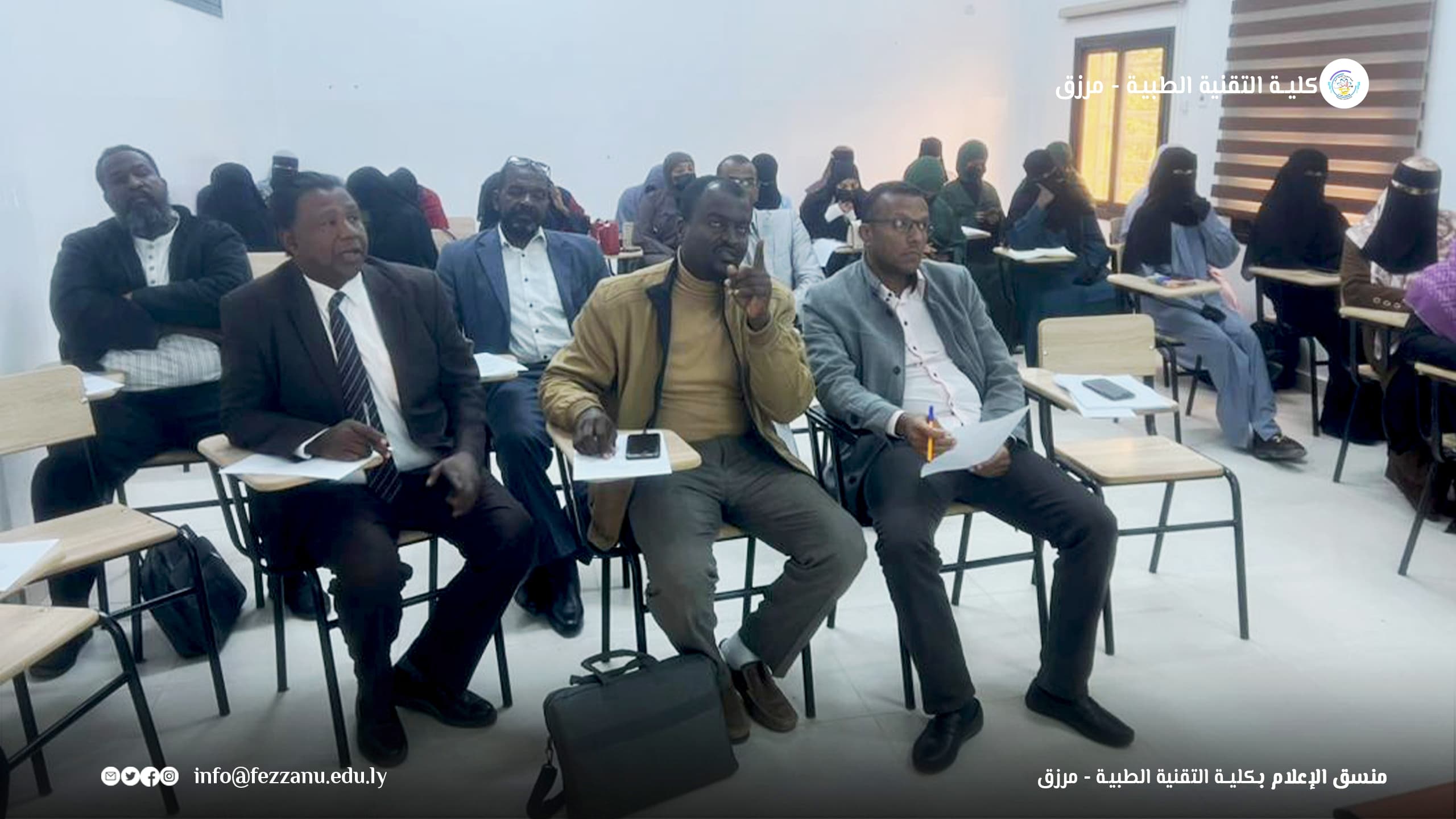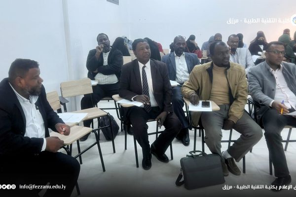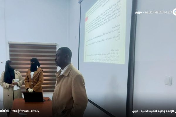 - ● في إطار جهود كلية التقنية الطبية الرامية إلى تأهيل الكوادر الطبية المتخصصة، وتخريجها وفق أسس علمية رصينة، شهدت الكلية صباح يوم الأحد الموافق (11-1-2026م) في مقر الكلية بمدينة – مرزق – مناقشة عدد من مقترحات بحوث التخرج في الأقسام العلمية الآتية :