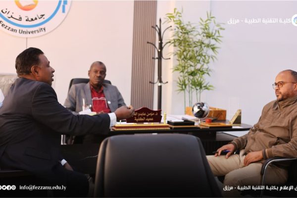● عقد د.مؤمن عابدو الخير عميد كلية التقنية الطبية، صباح يوم الأحد الموافق (23 / 11 / 2025م) في مكتبه اجتماعًا مع كل من د. سالم إبراهيم الحاج علي مدير إدارة الدراسات العليا بالجامعة، و أ.د. النور محمد أحمد العالم مدير قسم البحوث والاستشارات العلمية بالكلية.