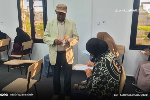 ● في إطار المتابعة المستمرة من إدارة جامعة فزان لسير الامتحانات، قام أ. بشير علي بشير، المسجل العام بالجامعة، رفقة أ. فتحي سليمان، مدير مكتب الدراسة والامتحانات بإدارة المسجل العام، صباح اليوم الاثنين الموافق (29-12-2025م) بزيارة تفقدية إلى كلية التقنية الطبية – مرزق – للاطلاع على سير الامتحانات النهائية بالكلية.