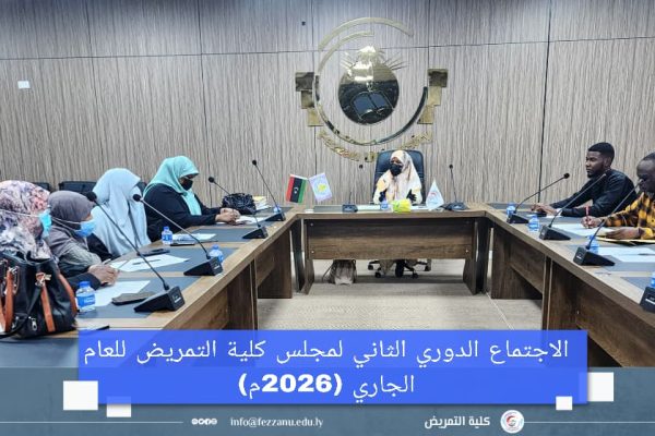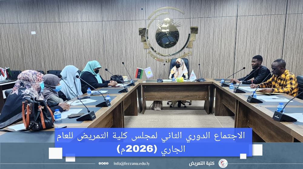 ● عقد مجلس كلية التمريض اليوم الأربعاء الموافق (25-3-2026م) على تمام الساعة (10:00) صباحًا، في قاعة الاجتماعات الرئيسية بمقر الكلية بمدينة – تراغن – الاجتماع الدوري الثاني للعام الجاري (2026م) برئاسة د. زمزم علي بشير، عميد الكلية، وبحضور أ. صالحة خميس، وكيل الشؤون العلمية، إلى جانب رؤساء الأقسام العلمية ومديري المكاتب.